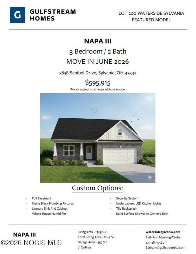 This house is not currently completed but will be available June 2026. Our new Napa III floor plan features a great room with a gas fireplace, Kitchen with a pantry, quartz countertops, and SS appliances. A covered back veranda to enjoy the outdoors. Primary bedroom with double vanity, custom quartz shower and walk in closet. Basement and pull down stairs for attic storage. Very private back yard. Call for plans and specs. Waterside offers a club house, exercise room and a swimming pool.